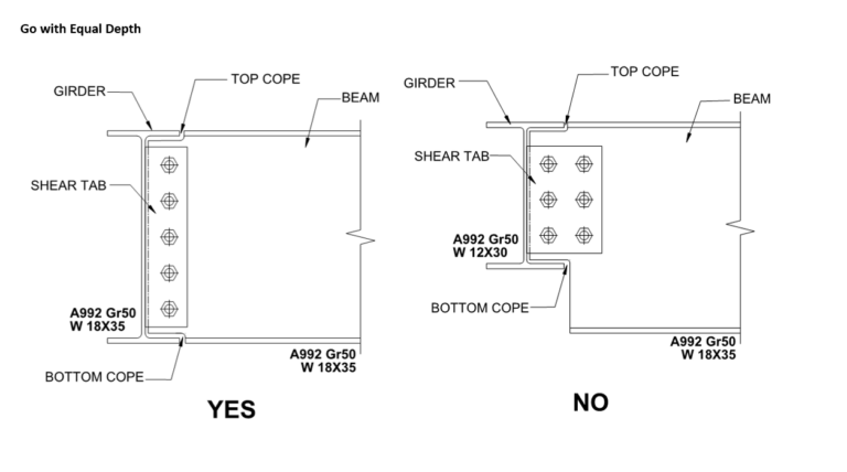 In some cases we encounter, the supporting girder depth is lower than the supported beam depth, which leads to more copes and possibly a new proposed connection. We suggest either using the same depth for both the supported beam and the supporting girder or providing coping connection details. This can eliminate unnecessary copes and reduce connection design and fabrication time.