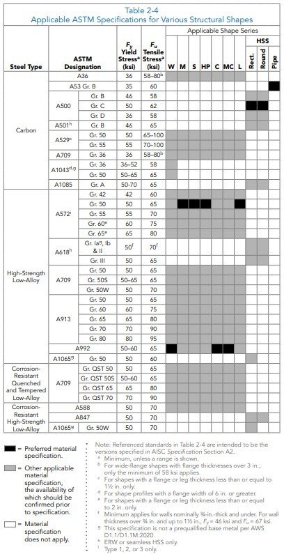 W-shapes: The preferred material specification for W-shapes is ASTM A992 (Fy = 50 ksi, Fu = 65 ksi). The W-shape grade remains consistent with previous AISC specifications, indicating that most steel structure detailing companies and designers adhere to these standards.